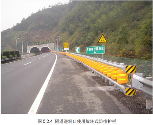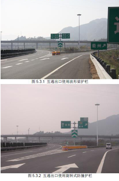 互通出口(閣5.3.1 >對行駛方向較為敏感,茁要駕駛員在栴路信息判斷基礎上.選擇正確行使路線.互通出口復雜的線形變化容易造成駕駛員在出口三炻端前遲疑決策.是影響運行安全的不利因素.統(tǒng)if資料表明,互通出口路段往往 相對亊故多發(fā),宜使用旋轉式防撞護欄(圖5.3.2),加強出口區(qū)域的誘導與防護。